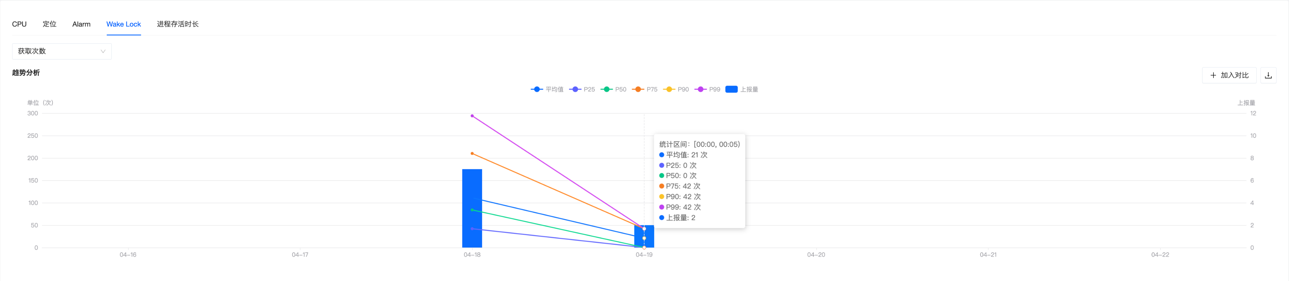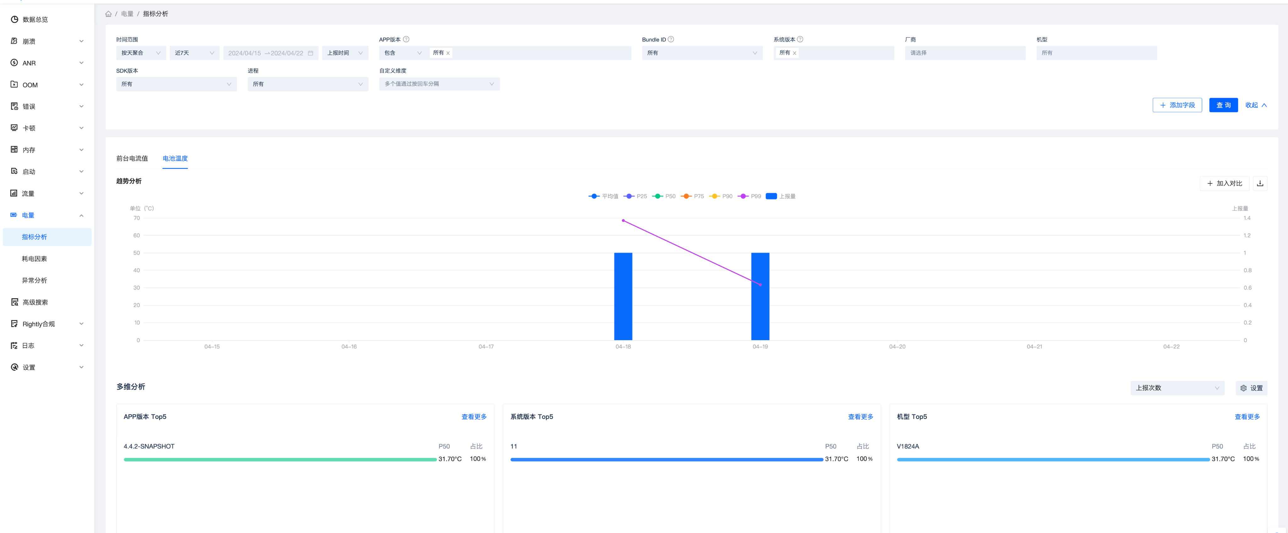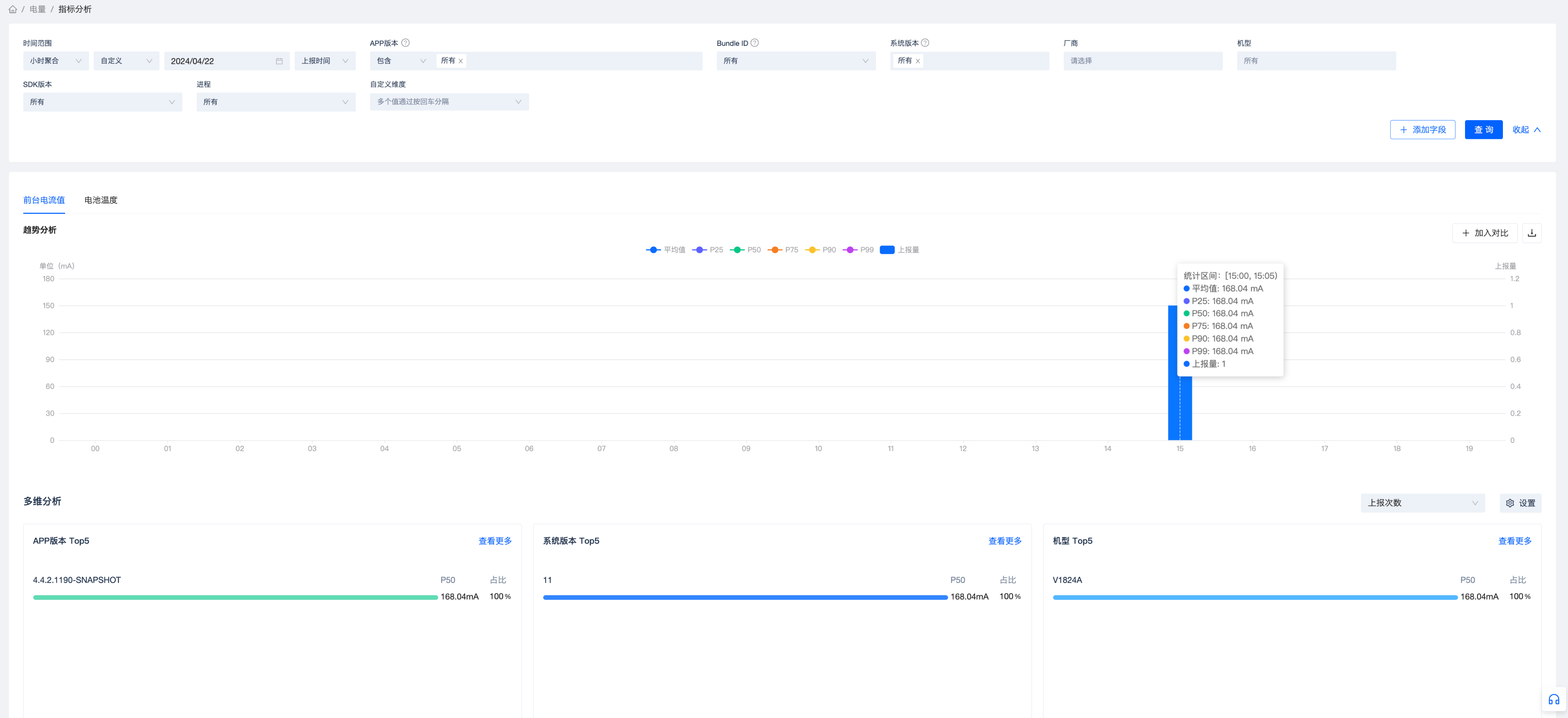 同时该指标统计的是统计的进程生命周期,所以是在进程重启之后才会上报,前台耗电指标主要用来从大盘衡量前台使用应用的时候用户的“体感”, 是否有过热以及掉电严重的问题,支持查看平均值以及各个分位值,同时也支持多维分析,查看不同版本、不同机型、不同系统版本的指标分位值。