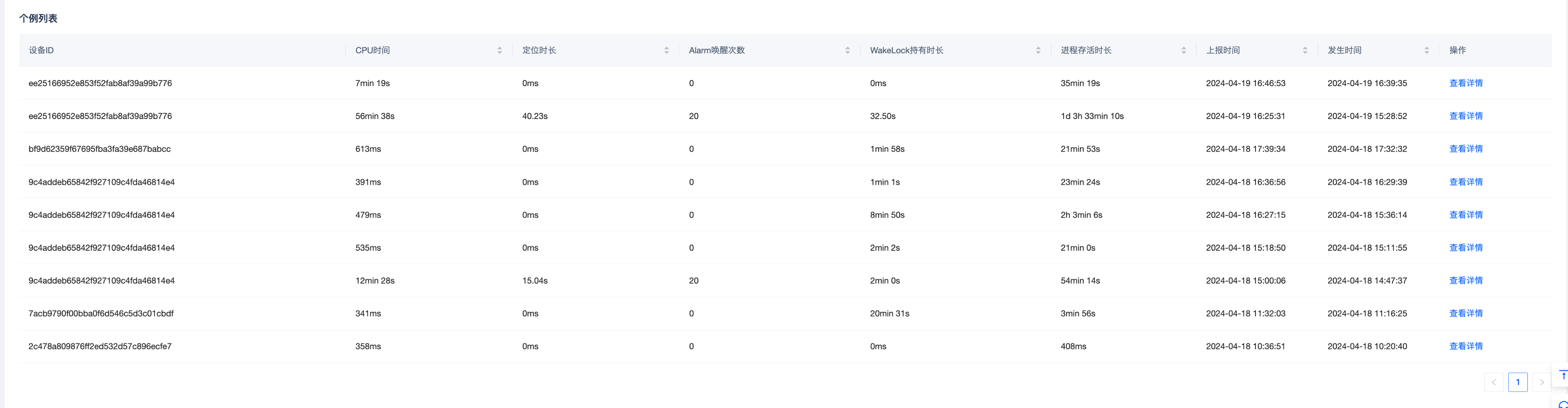 耗电因素指标除了查看不同指标的分位值之外,还可以查看不同设备ID的上报详情信息,点击“查看详情”,可以跳转到高级搜索页面