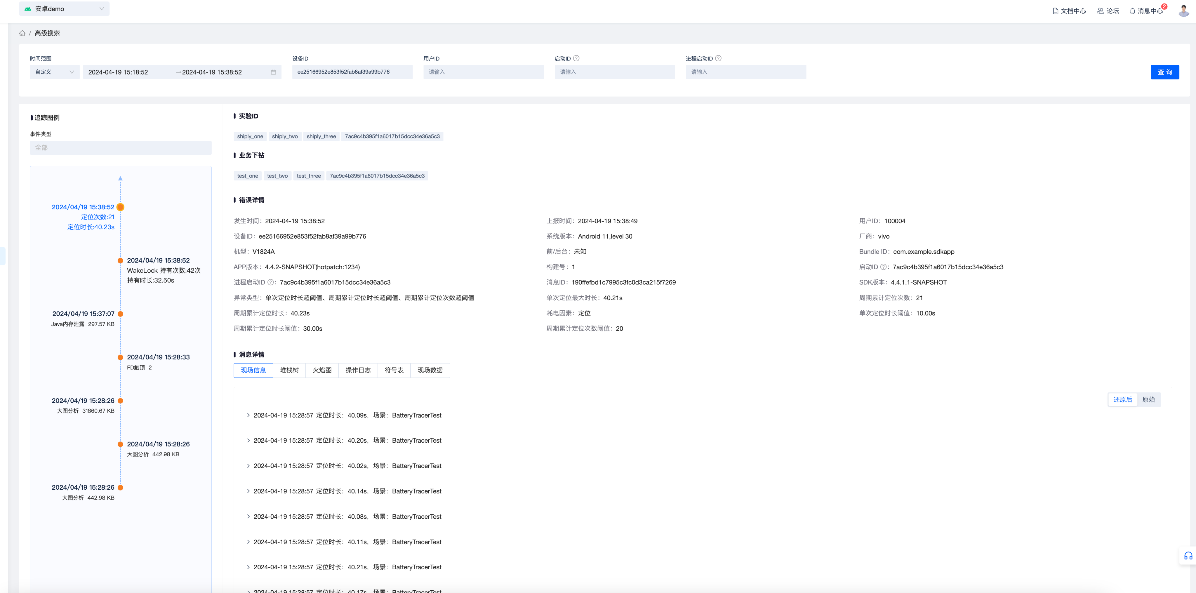 在高级搜索页面能查看这台设备在选定周期内发生的所有事件,例如所有的耗电因素异常个例的上报、启动事件、卡顿等事件的上报也会包含。