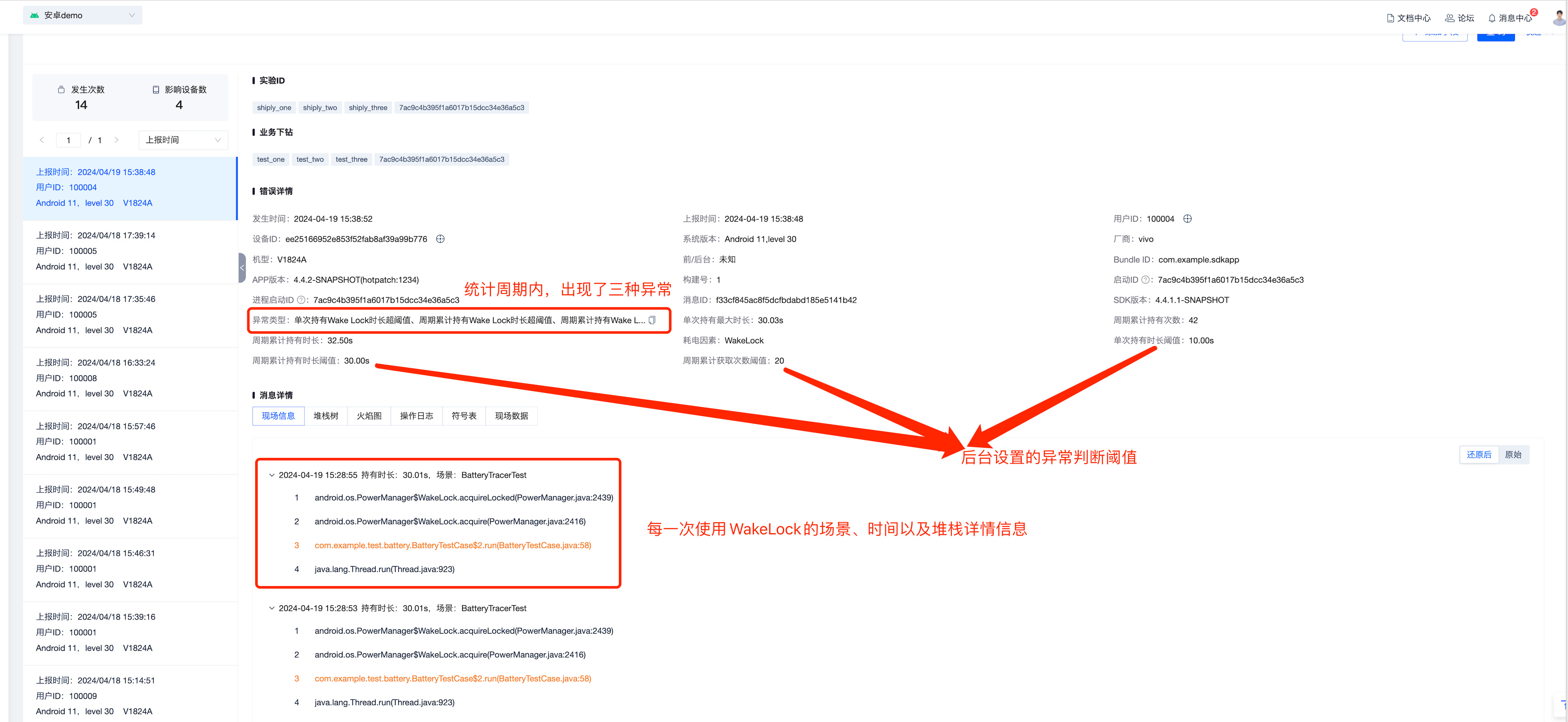 3、耗电因素异常个例,固定周期内,如果硬件使用的次数或者时长超过某个阈值,则会被认为是异常个例,针对异常个例,Bugly会提供堆栈以及每次开启的时间以及持续时长等信息来供下钻分析。