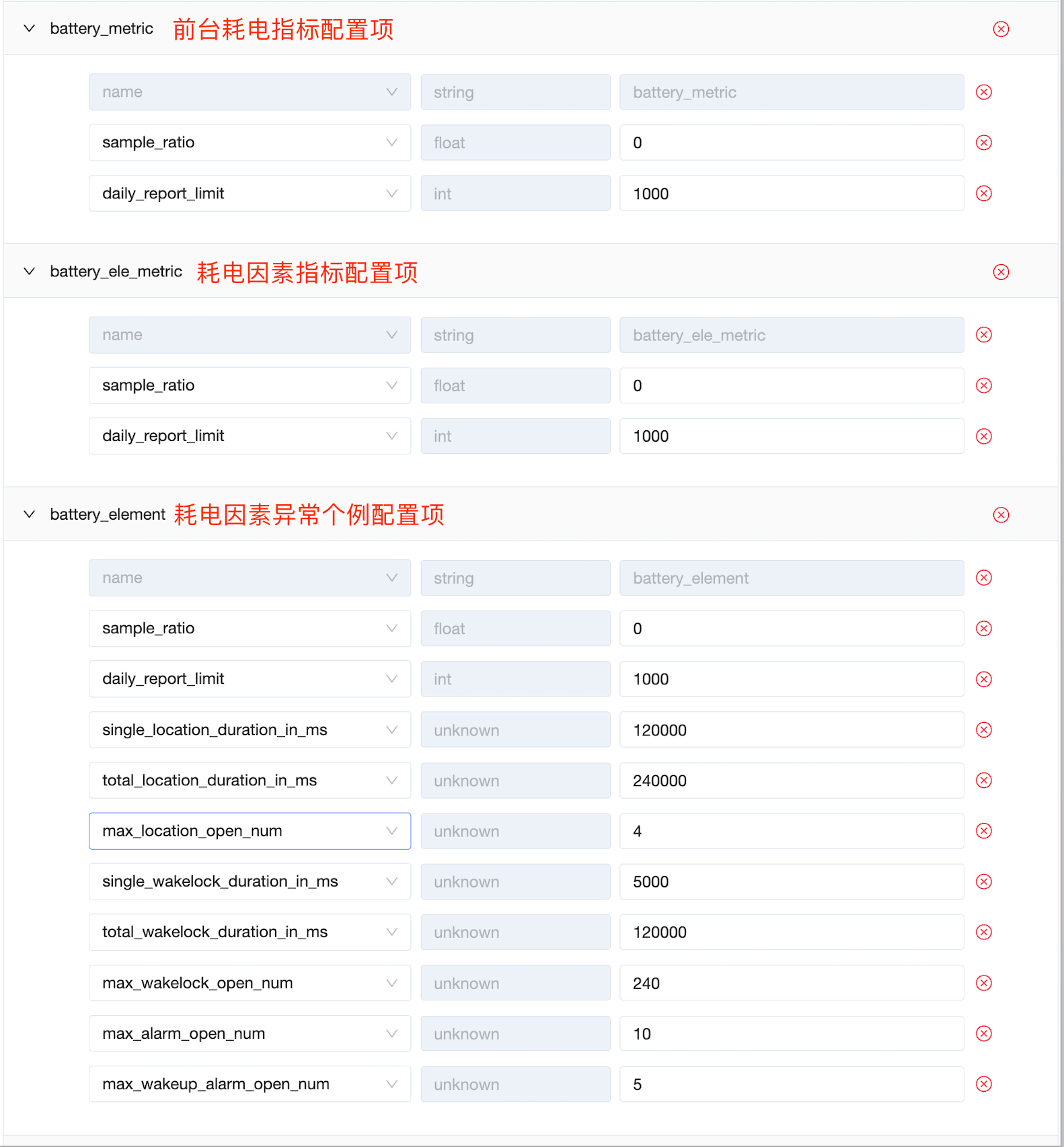 电量监控这个功能后台配置默认是关闭的,所以即使客户端调用了startMonitors也还是无法开启的,需要在产品的配置页面新建或者添加配置项,接入调试阶段,建议sample_ratio都配置为1,也就是全开启。